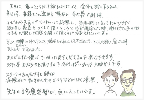納得がいくまで説明して下さる事です。お忙しいのはよくわかっています。でもゆとりをもった話し方をして下さるので気分が落ち着きます。多少待ち時間が長くても他の方もすっきりとしたお顔で診察室からでていらっしゃるのでOKです。